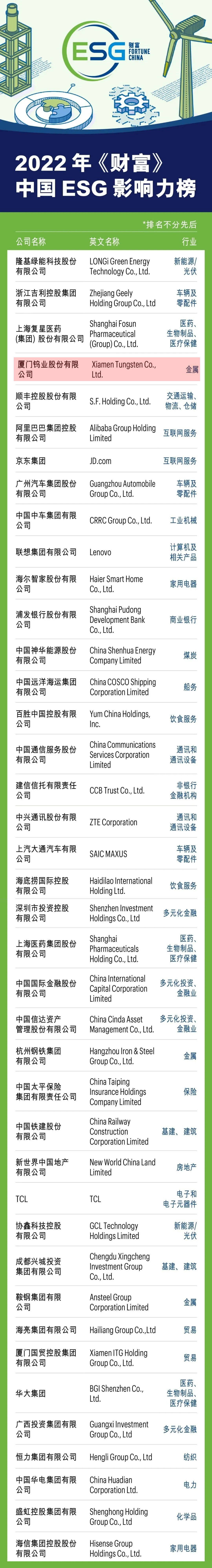近日,,《财富》发布首份中国ESG影响力榜,,有40家在改善环境、、、、保护员工、、、支持社区上做出了卓越努力的中国企业上榜,,,,厦门钨业成功入选。。