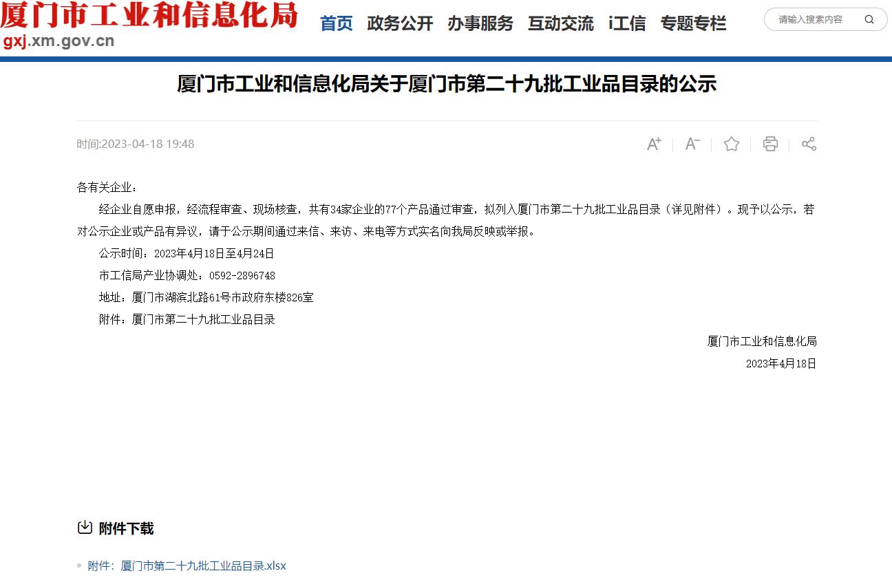 4月28日,,,厦门市工业和信息化局于公示期结束后正式发布厦门市第29批工业品目录,,厦门尊龙时凯智动科技有限公司名列其中。。。