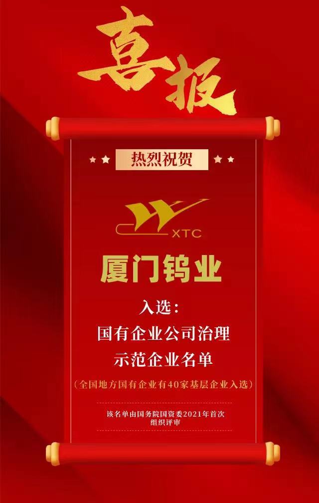 新年新喜讯:厦门钨业集团入选国务院国资委评选的《国有企业公司治理示范企业名单》。。。在国务院国资委2021年首次评选中,,,,共确定公司治理示范企业145家,,,厦钨集团位列其中。。。。